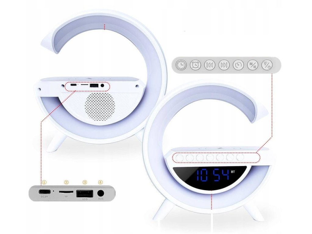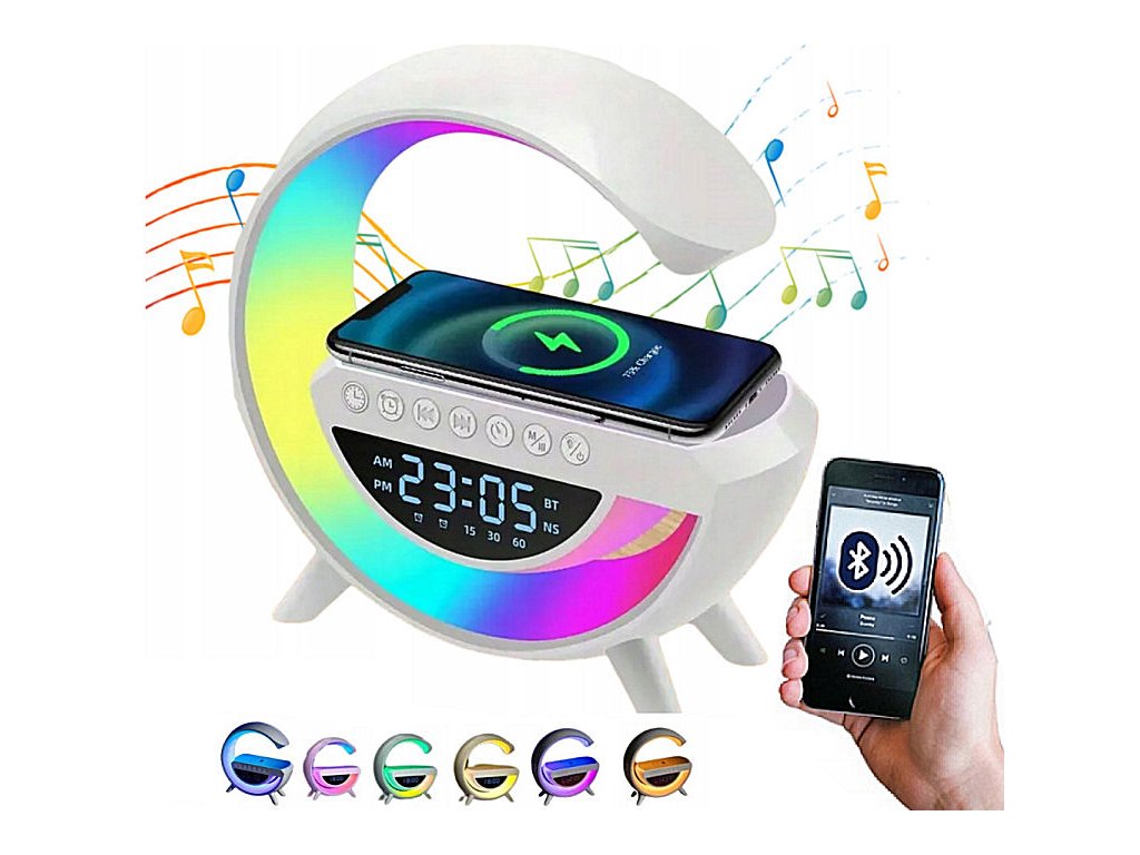 Multifunkční lampa s indukční QI nabíječkou, Bluetooth LED RGB reproduktorem a hodinami s funkcí budíku je univerzální lampa, která se bude dobře hodit do každodenního života.