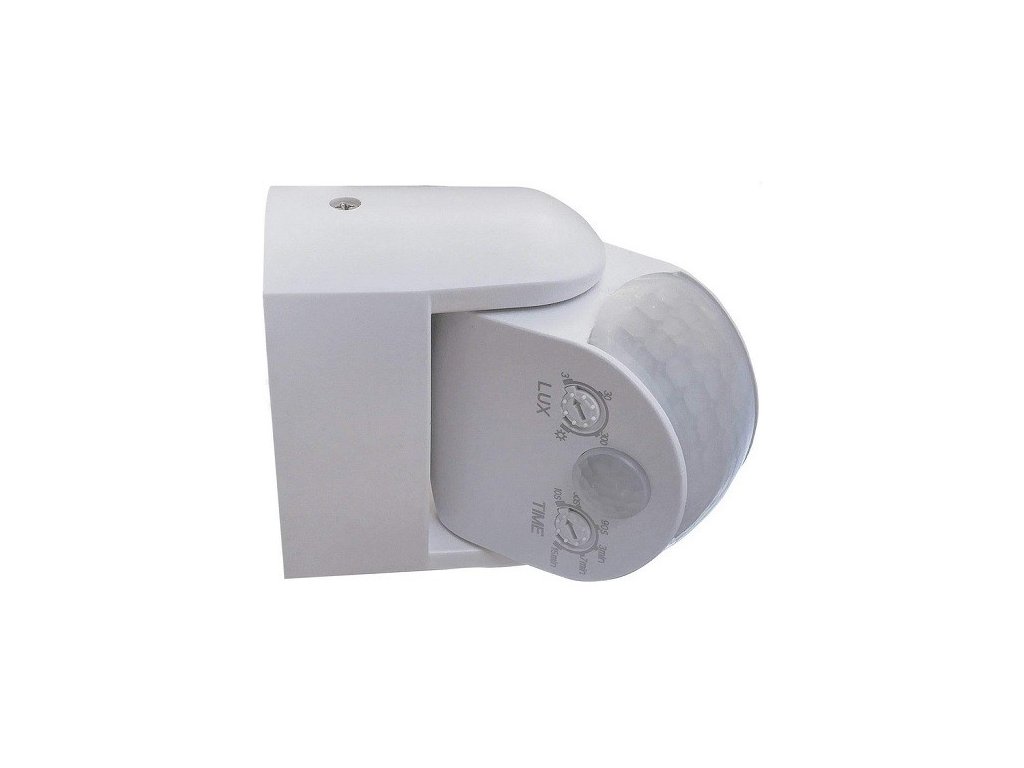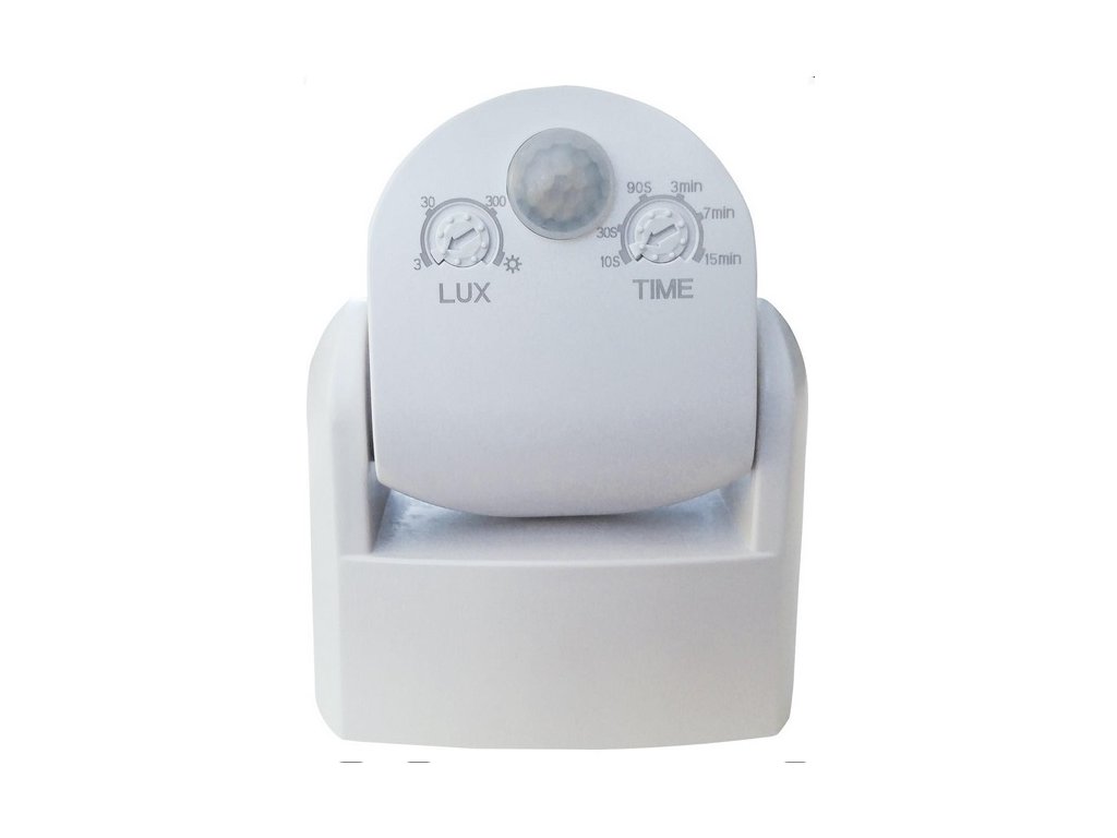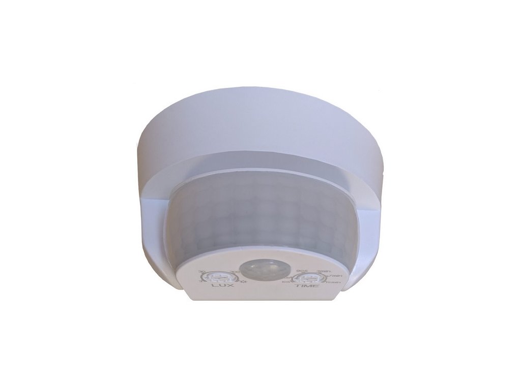 Senzor pohybu PIR (pasivní infračervený). úhel záchytu 180°/120°/360°, dosah 12m, doba sepnutí regulovatelná 10s-15min, regulace citlivosti na okollní světlo 3-2000Lx