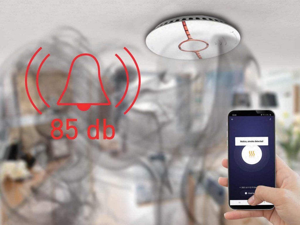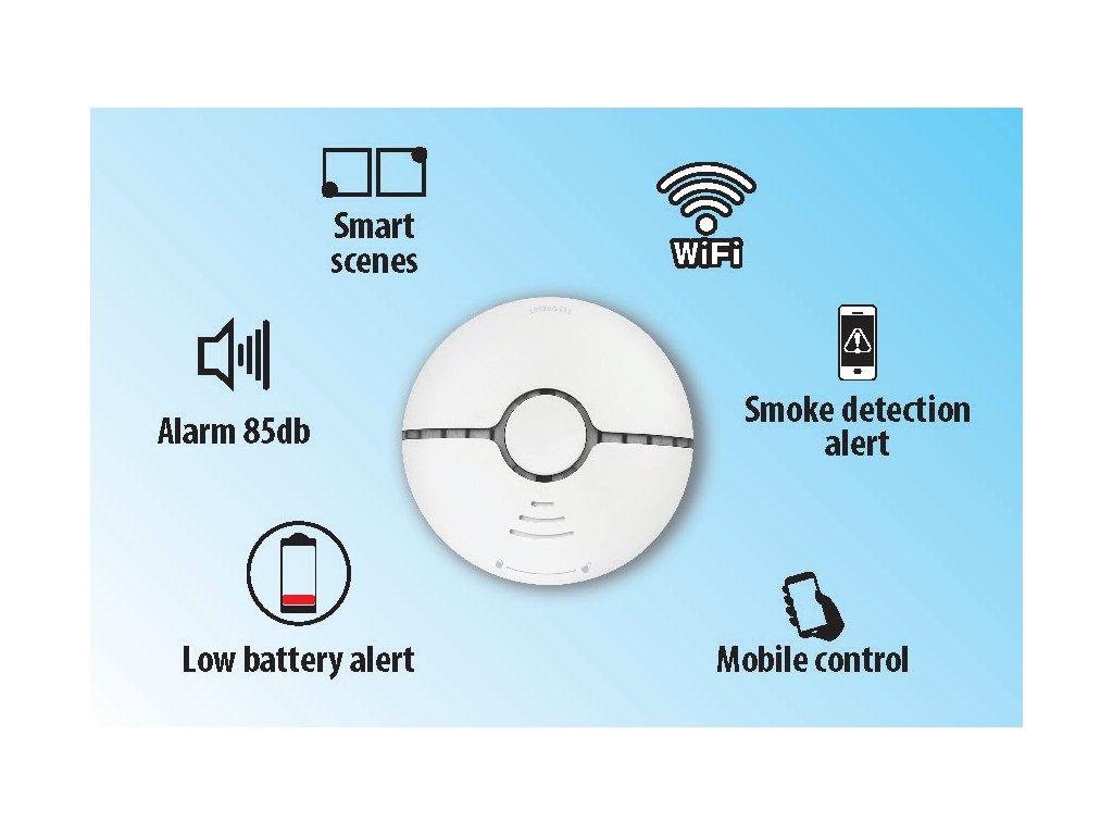 Upozornění na přítomnost kouře akustickým alarmem (85db) a notifikací.